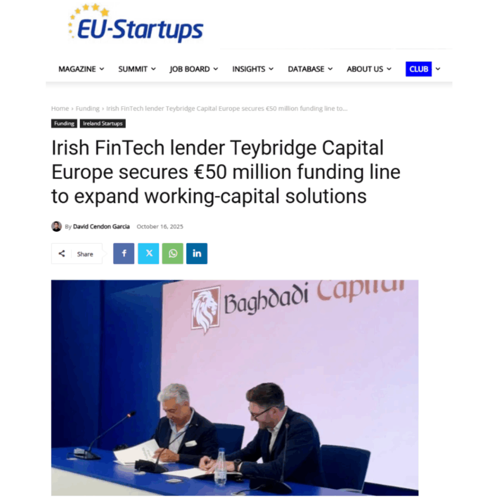 EU-Startups Article: Irish FinTech lender Teybridge Capital Europe secures €50 million funding line