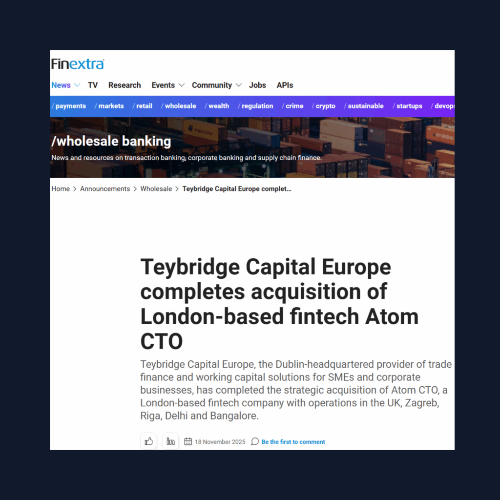 Finextra Article: Teybridge Capital Europe completes acquisition of London-based fintech Atom CTO